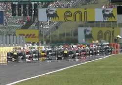 S. Vettel takes the turn first before F. Alonso and M. Webber